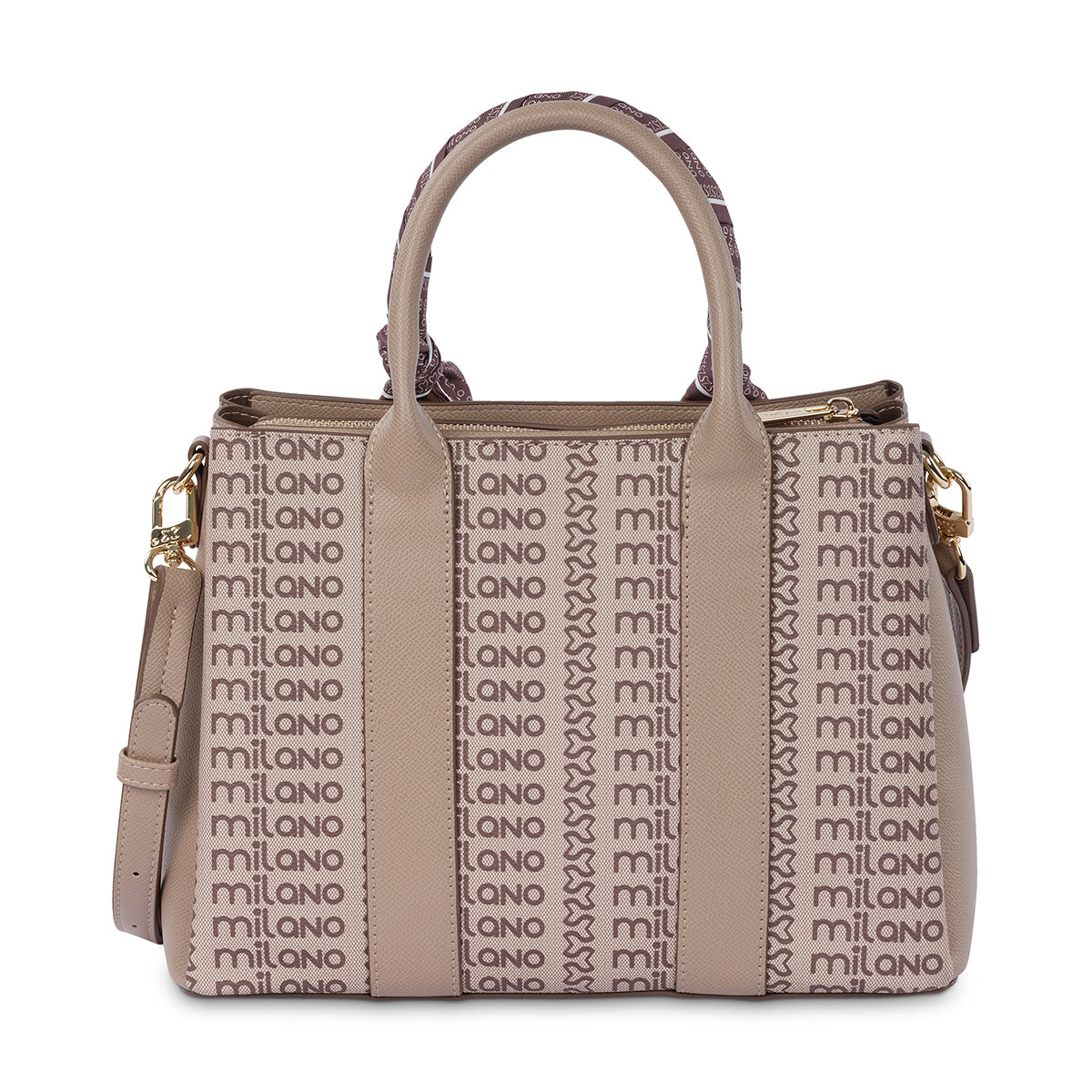Carry your essentials with branded elegance in our structured tote bag. Featuring a chic beige body with distinctive vertical "Milano" logo stripes and sleek solid accents, this bag is complemented by a fashionable scarf-wrapped handle. With a secure zip top and a versatile detachable strap, it's a perfect blend of style and functionality.