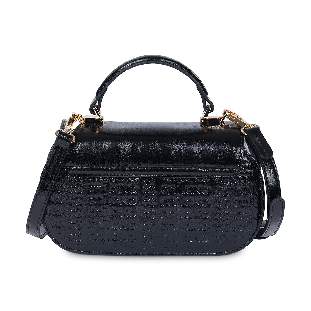 A classic accessory with a modern twist, the 'Hamesha' handbag is designed to make a statement. This sleek, black bag features a structured top handle and a bold gold-tone clasp with a distinctive logo. The side panels are embossed with a repeating pattern, adding a subtle touch of brand identity to its timeless design.