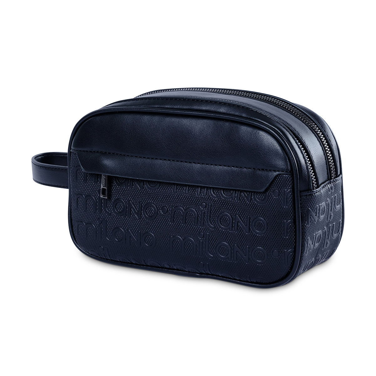 Black embossed monogram wash bag with contrasting panelling, grab handle and a complementary sporty Milano badge. Featuring front zip pocket, Milano branded puller and internal phone pockets for added security.