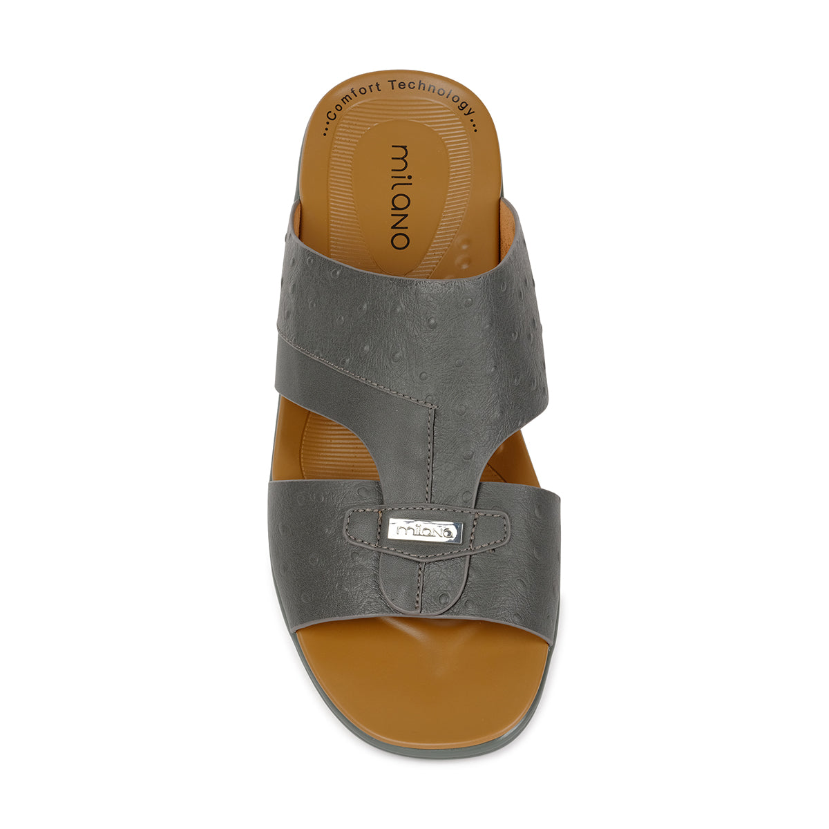 Experience everyday comfort and effortless style with this premium men’s slide sandal. Designed with a sleek grey upper and a supportive footbed, this sandal combines practicality with a refined look—perfect for daily wear, travel, or relaxed outings. The dual strap design offers a secure yet comfortable fit, with a metal trim detail for added appeal.
