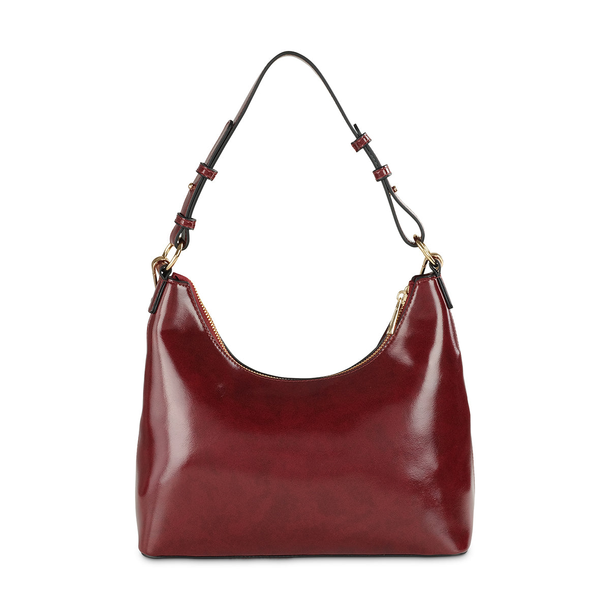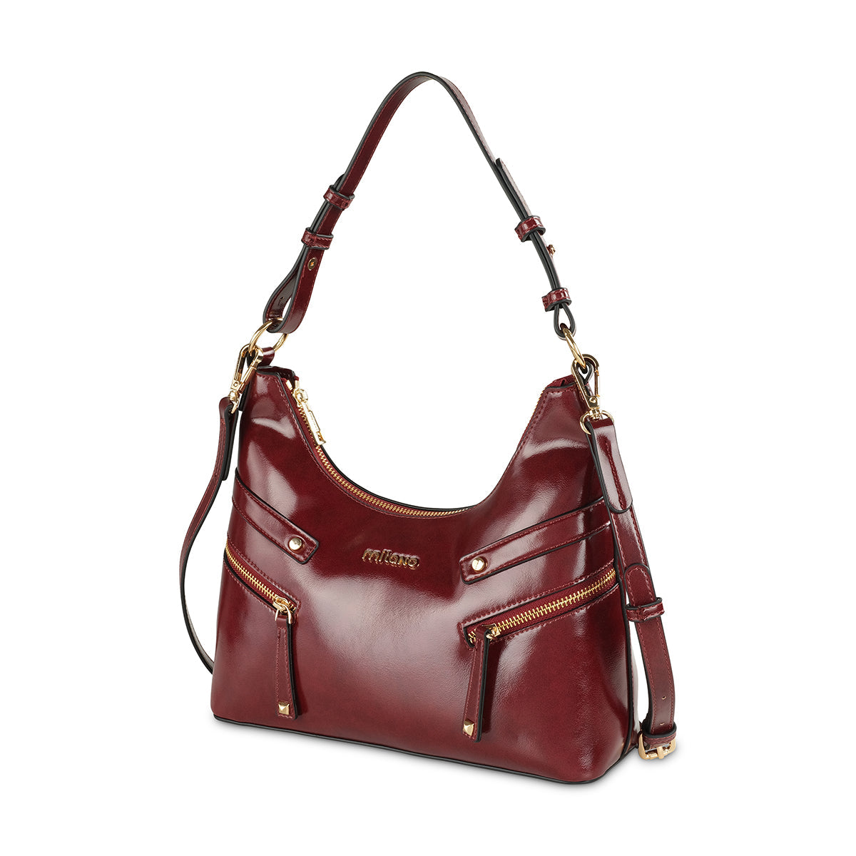 A modern classic with an edgy twist, our 'Milano' hobo bag is a standout accessory. Made from a high-shine, deep burgundy material, it features multiple exterior zippers and gold-tone hardware for a bold look. The spacious interior and detachable strap make it a versatile bag for any occasion.