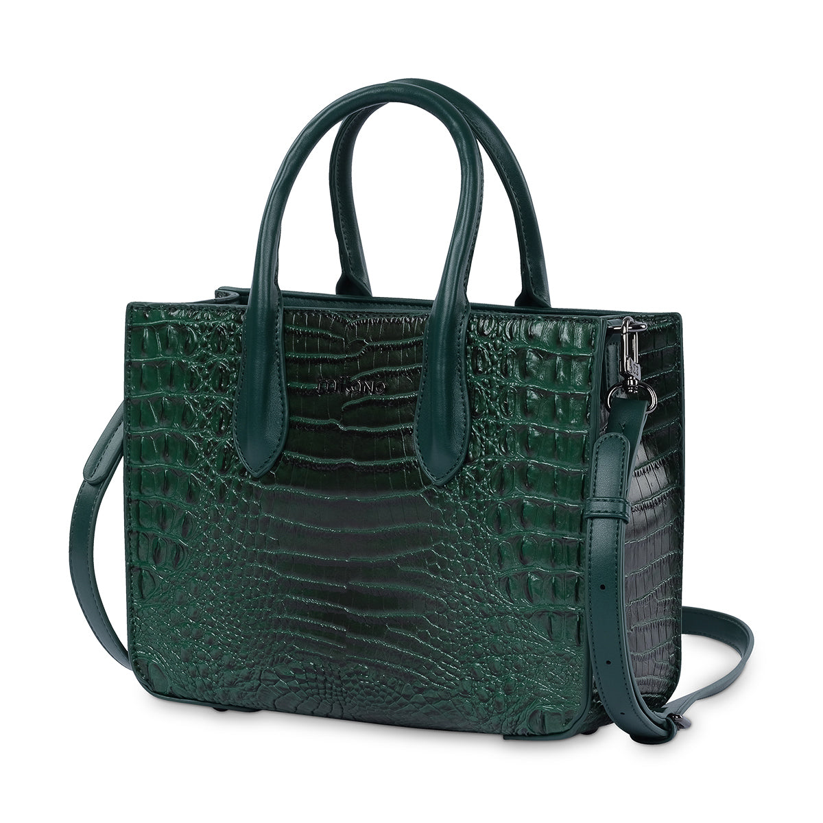 Introducing the 'Sheryl', a handbag that blends exotic allure with modern sophistication. Crafted with a striking green crocodile-embossed finish, this structured bag commands attention. The elegant top handles and detachable strap provide versatile carrying options, making it a luxurious statement piece for any fashion-forward individual.