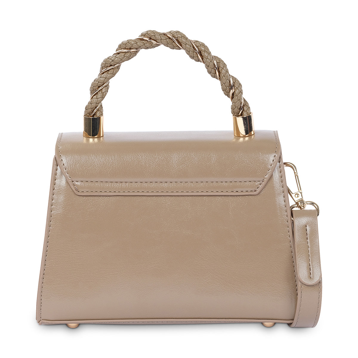 A sophisticated taupe satchel with twisted, woven handle detailing alongside a premium drop lock closure. The inner features a zip pocket for additional security and an adjustable strap provides the option of styling as a crossbody bag as well as a cute grab bag. Matching footwear available