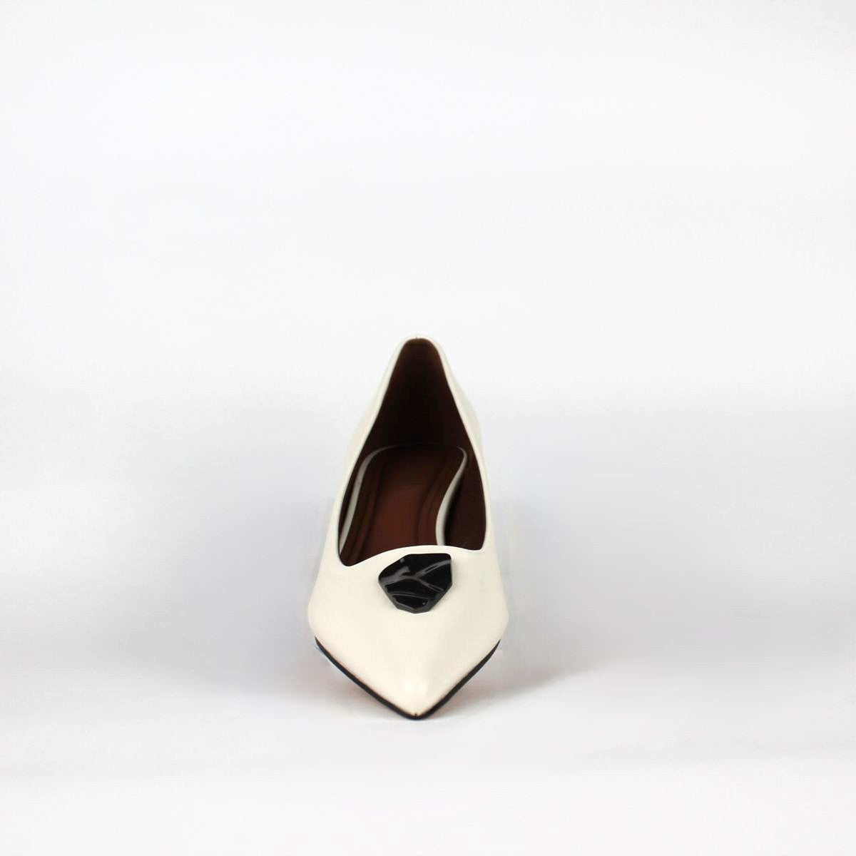 Elegant pumps featuring a sleek pointed toe and a sophisticated kitten heel. Crafted from smooth leather, these shoes are adorned with a polished, decorative buckle on the front. A perfect choice for adding a touch of class to both professional and evening ensembles.
