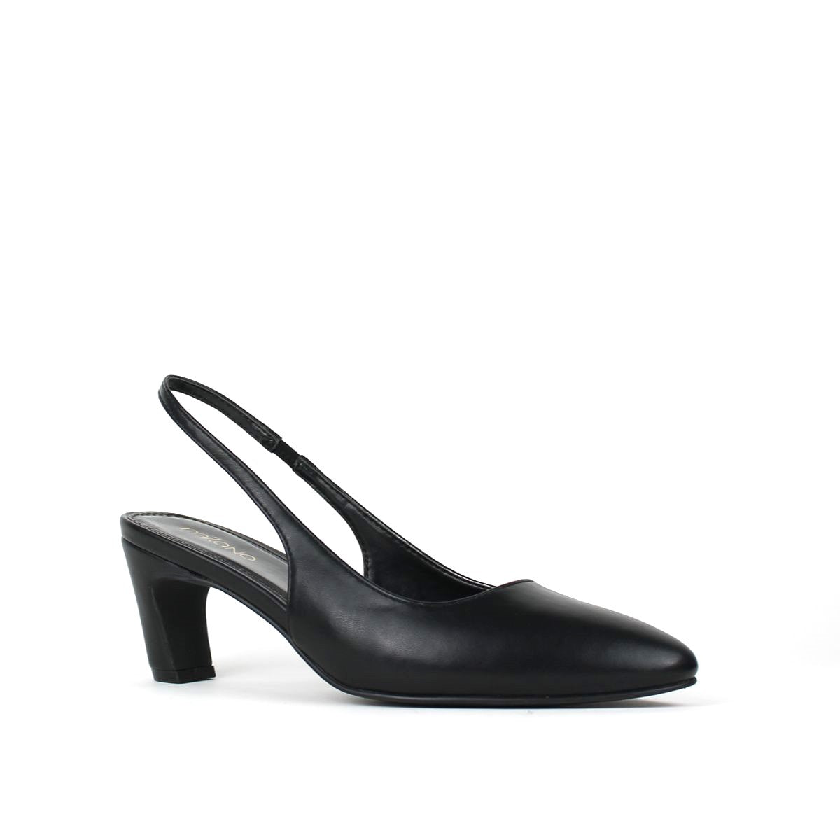 Iya slingback pumps. The shoes feature a smooth, black leather-like upper and a classic almond toe. They are designed with a sturdy, flared block heel for stability. An adjustable slingback strap provides a secure and comfortable fit. Perfect choice for a variety of occasions