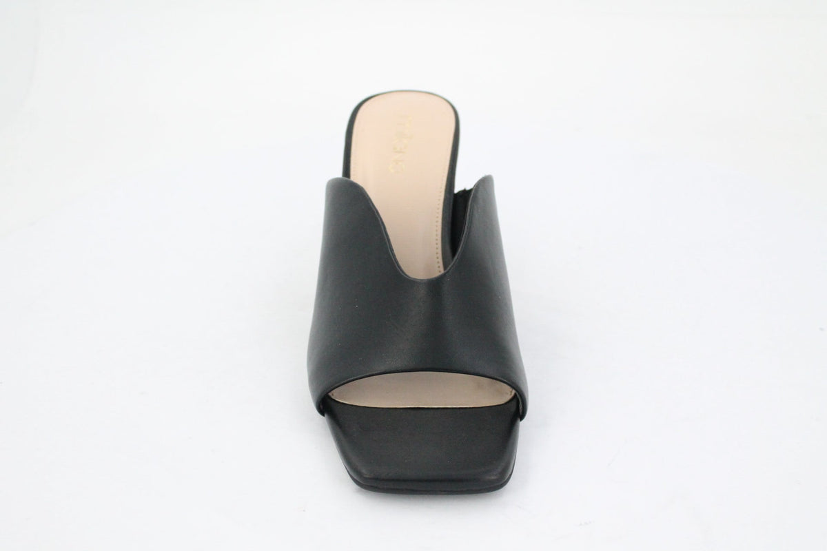 Step out in style with these Karmen Heel Mules. Crafted from smooth black leather like finished, these mules feature a unique, sculptural gold-tone heel and sole that elevates any look. The open back and square toe add a modern touch, making them a statement piece for any fashion-forward wardrobe.