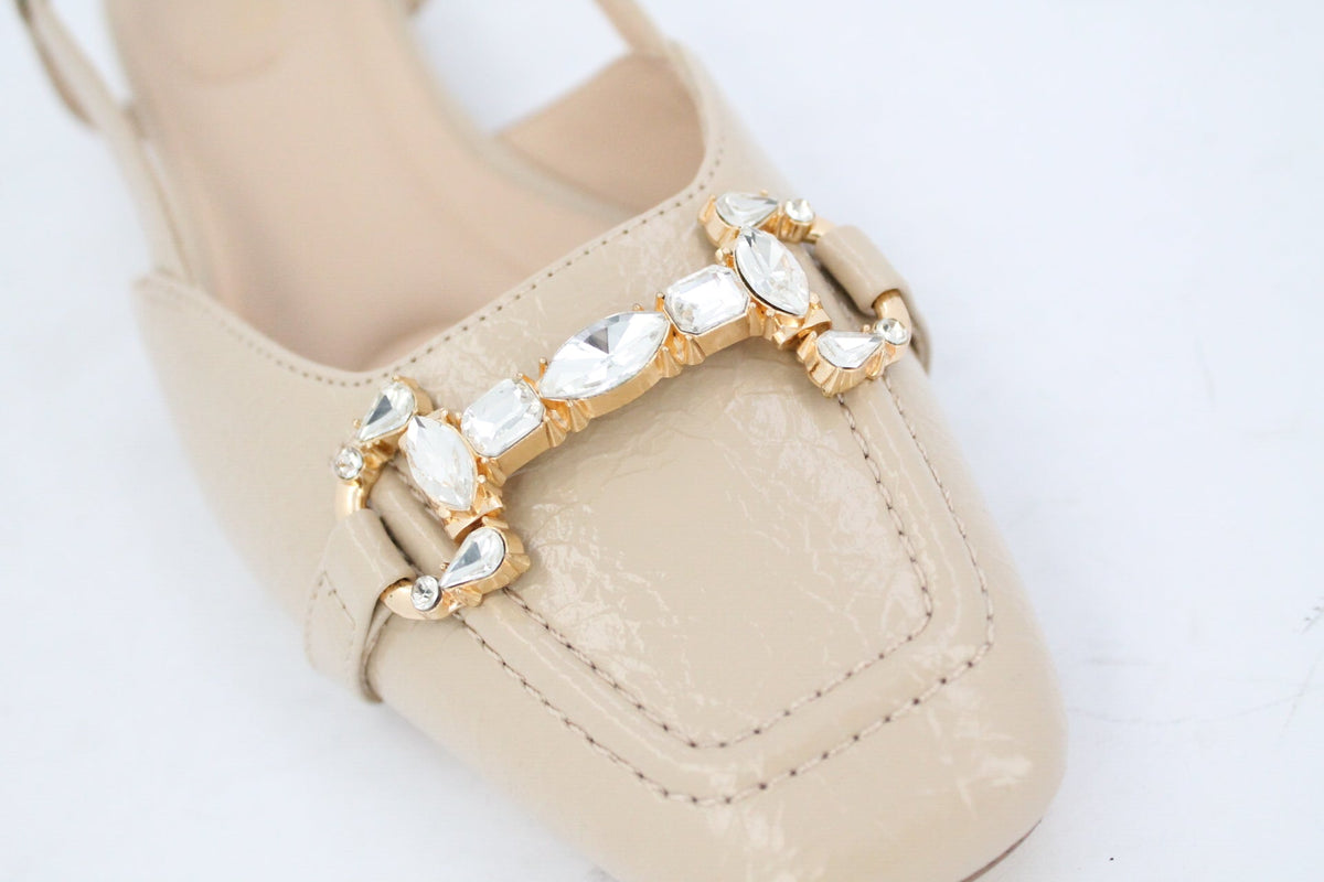 The VARA Slingbacks in beige. The soft beige leather like looks so elegant, and you can see the low, comfortable heel and the subtle shine of what must be the gold-toned sole. The slingback design with the delicate straps also adds to their refined look.