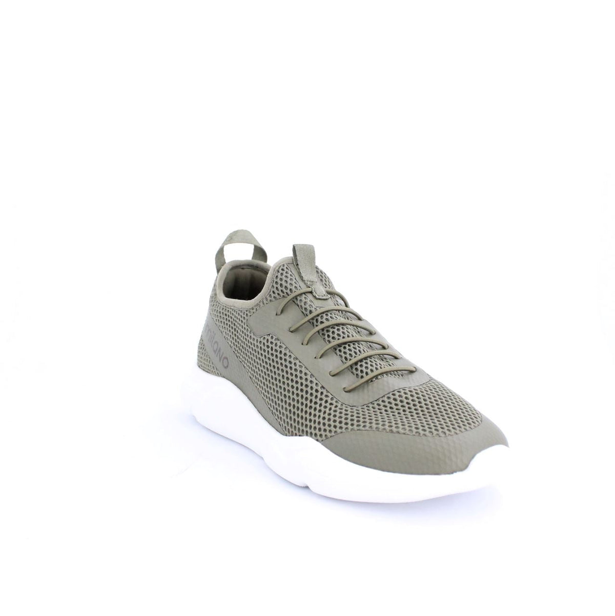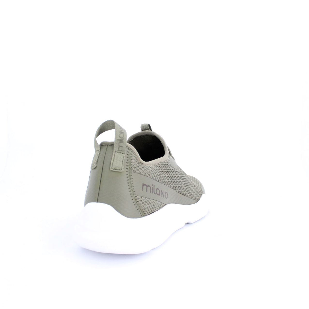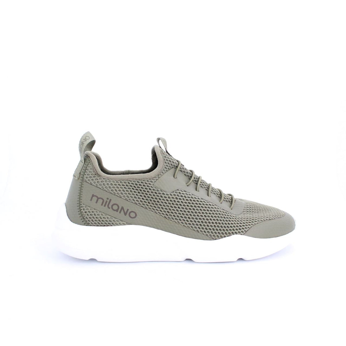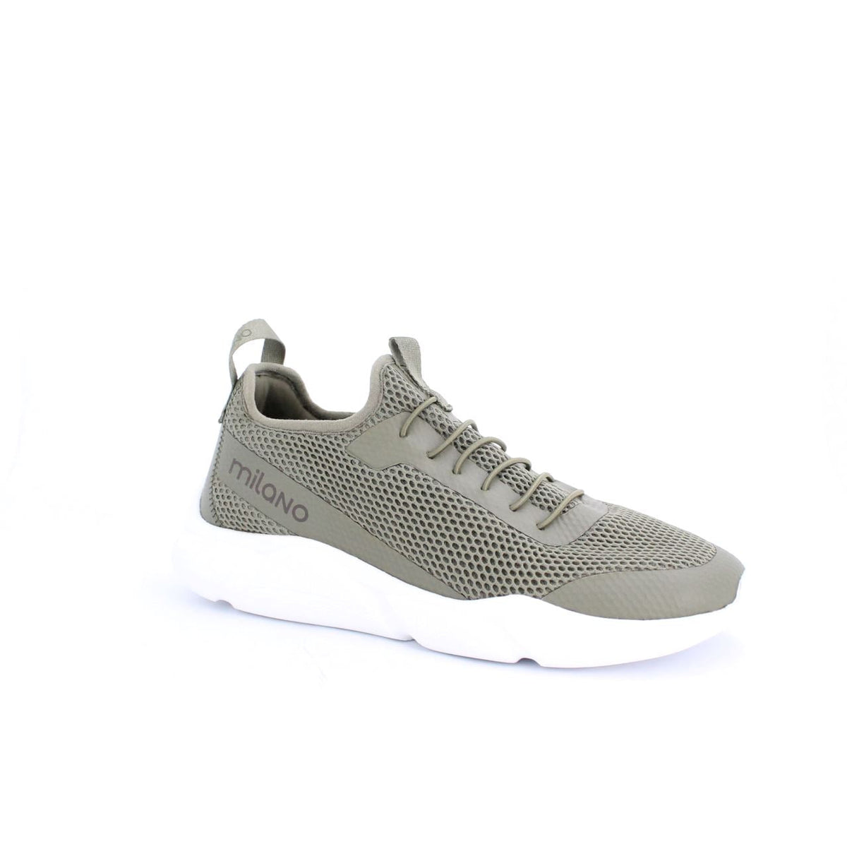 A  casual sneaker  with a modern and minimalist design in a muted green or olive tone. The upper part appears to be made of a breathable mesh material for comfort and ventilation and It is a lightweight and versatile shoe suitable for casual or everyday wear. These shoe has a memory foam insole for added comfort.