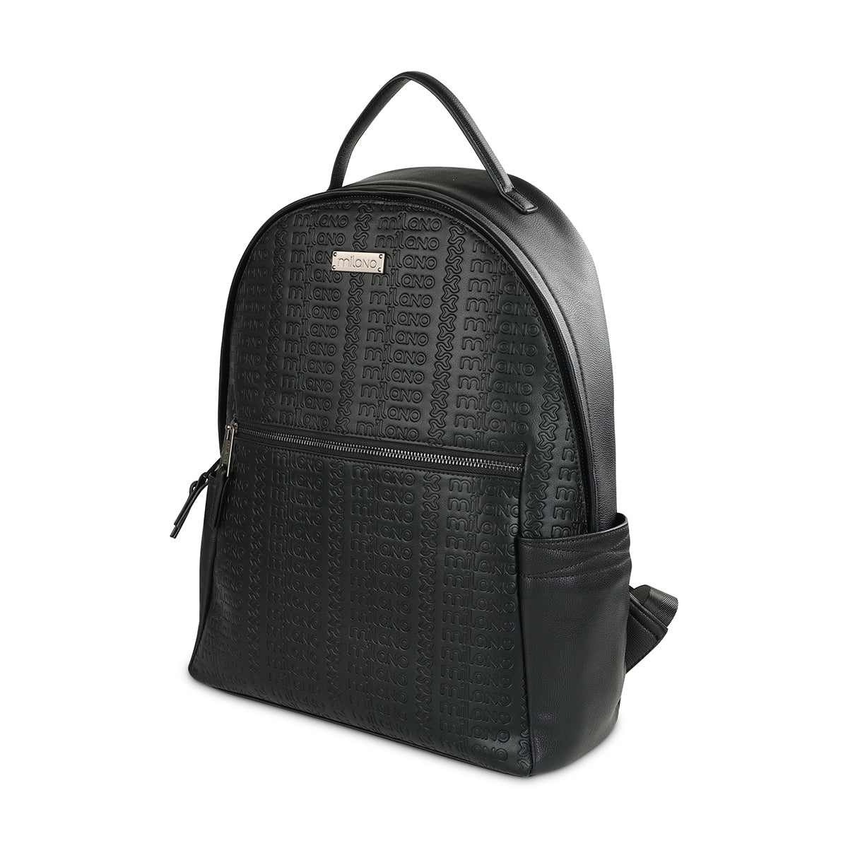 Discover urban sophistication with our sleek black backpack. Featuring a distinct monogram print on its front pocket and a polished metallic "Milano" logo, this bag combines modern style with everyday practicality. It offers ample storage, secure zip closures, and comfortable adjustable straps for effortless wear.