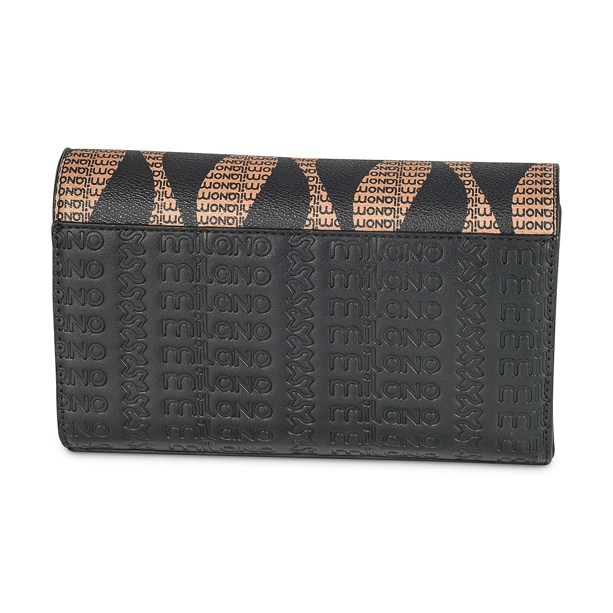 Make a captivating statement with our unique two-tone Milano clutch. Its distinctive design features a tan and black patterned flap with "Milano" text, complemented by a subtly debossed black base. Adorned with polished gold-tone hardware and a versatile detachable strap, this bag is a chic and functional accessory for any occasion.