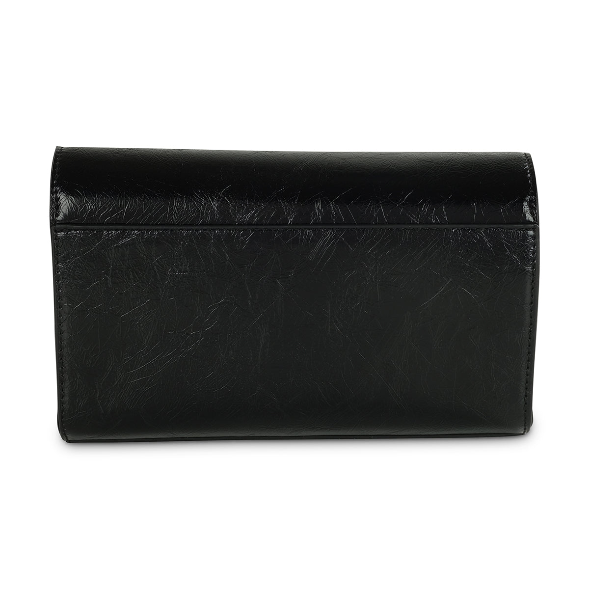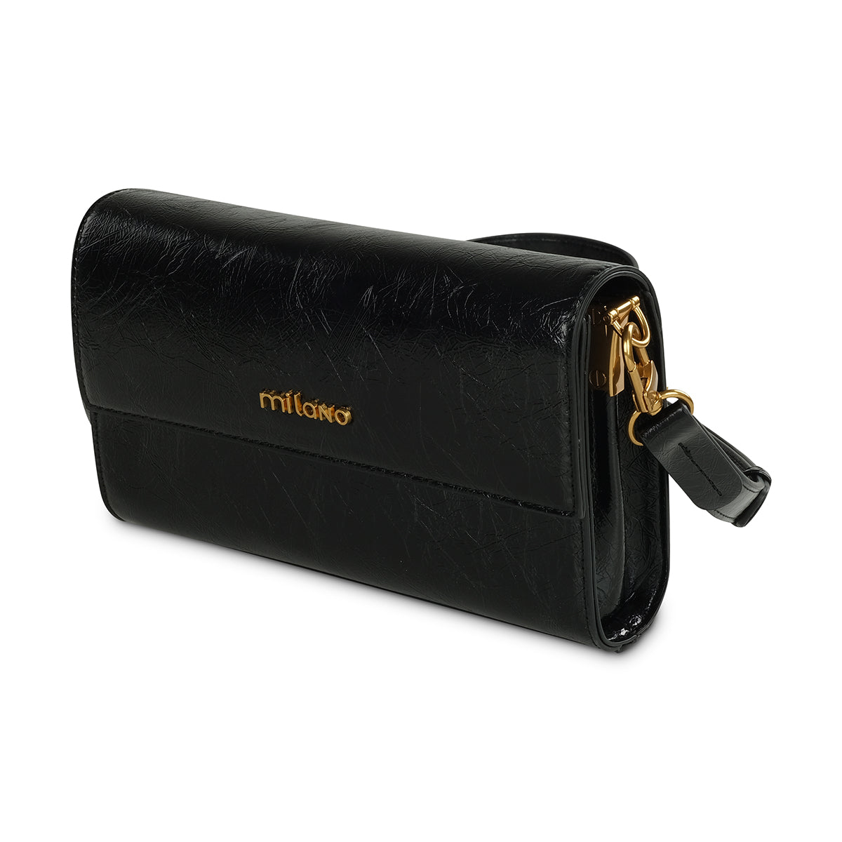 Make a sophisticated statement with our two-tone glossy bag, featuring a striking contrast of black and dark brown. Its high-shine finish and structured silhouette are accented by a subtle metallic "Milano" logo and a versatile adjustable strap, making it a chic choice for any occasion.