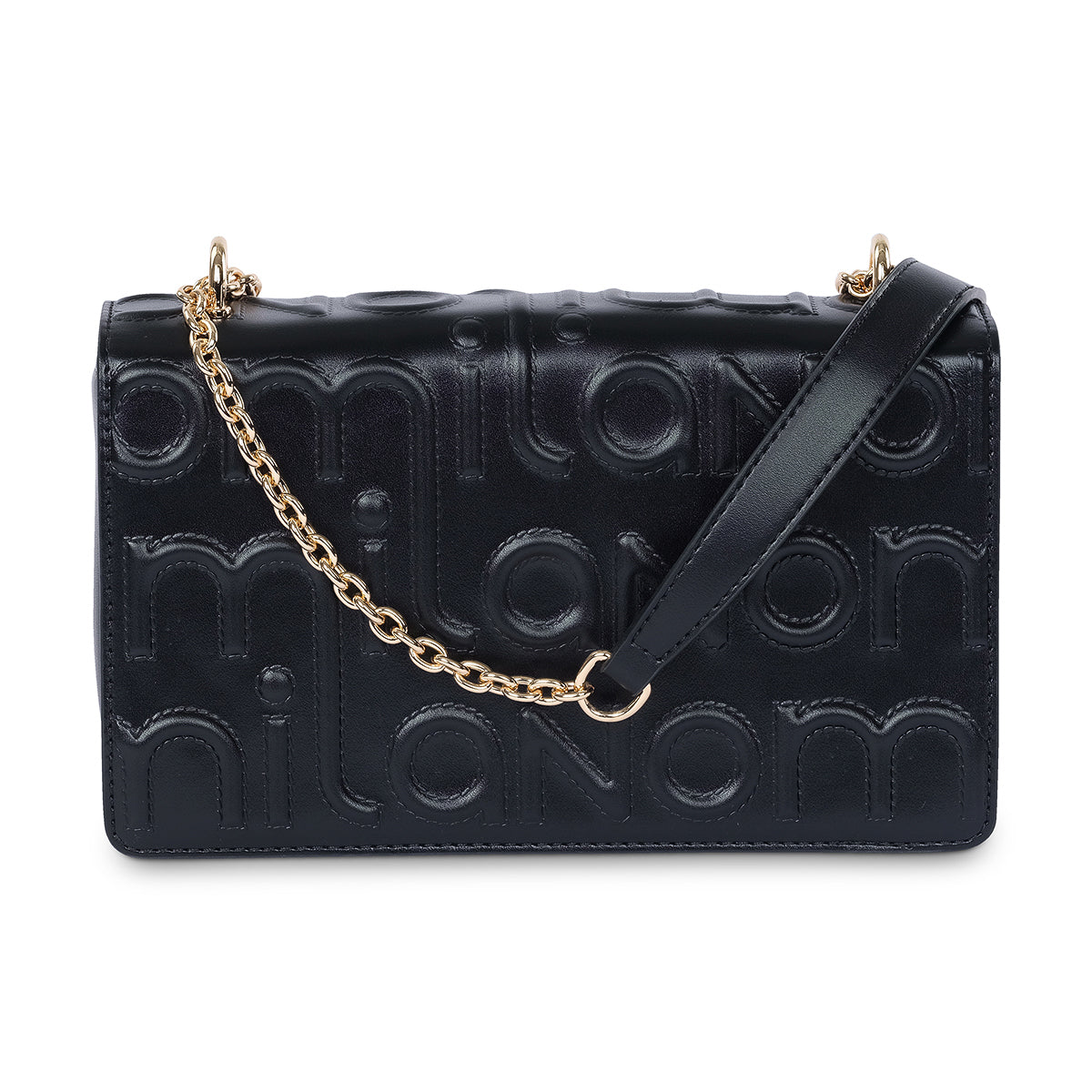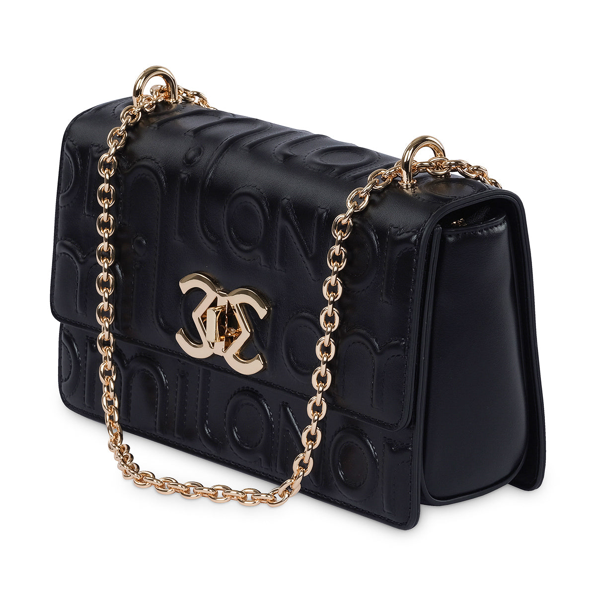 Elevate your look with the 'Donne' handbag, a piece that blends classic elegance with a bold, modern feel. Crafted from a luxurious black material with a striking, embossed pattern, this bag features polished gold-tone chain straps and a secure front closure with a signature logo. Its structured design ensures it holds its shape while adding a sophisticated finish to your ensemble.